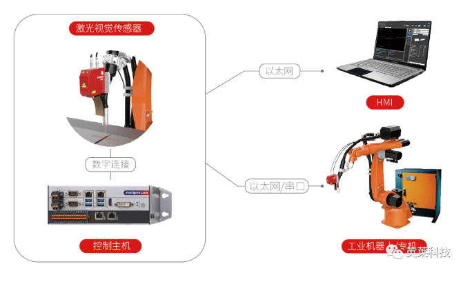 英萊激光視覺焊縫跟蹤系統(tǒng)由焊縫跟蹤傳感器及控制主機組成,傳感器負責焊縫信息的主動采集,控制主機負責焊縫信息的實時處理,并與工業(yè)機器人或焊接專機保持實時通訊,讓工業(yè)機器人或焊接專機實現(xiàn)焊縫尋位、焊縫實時跟蹤的功能,識別焊縫偏移矯正焊接軌跡,實現(xiàn)真正的智能化焊接。